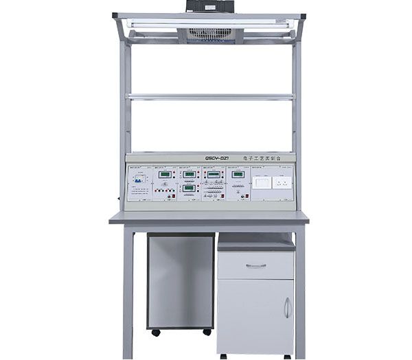 本实训台可提供20个工位,每个工位均配备照明日光灯、工艺看板(用来夹放资料)、仪表台、插座、工具柜、实训线路板、实训工具(数字万用表、元件盒、电烙铁剪刀、剥线剪、螺丝刀等)。学生在这里可完成电子产品生产过程模拟实训(如:工艺流程的编制、线路板的焊接、线路板的调试、整体产品的组装)。